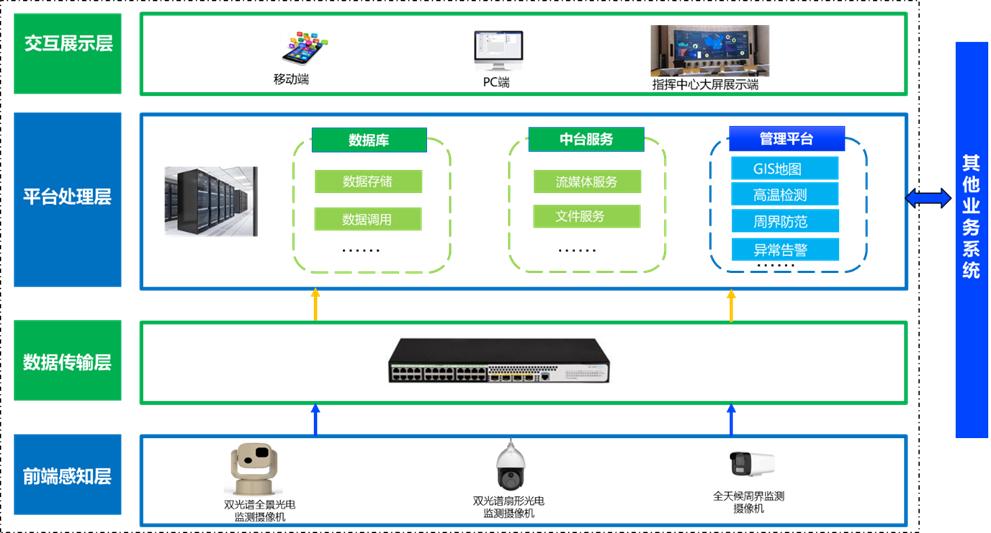 光伏发电场智慧化安全监测系统主要包括以下几部分:前端感知层、网络传输层、平台处理层以及交互展示层,系统架构如下图所示。