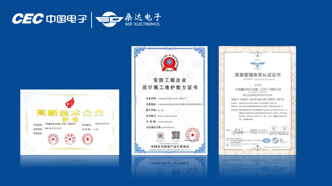 高新技术企业、2024年获南京市科技局认定为南京市工程技术研究中心、安防工程企业设计施工维护能力壹级、ISO9001质量管理体系认证。